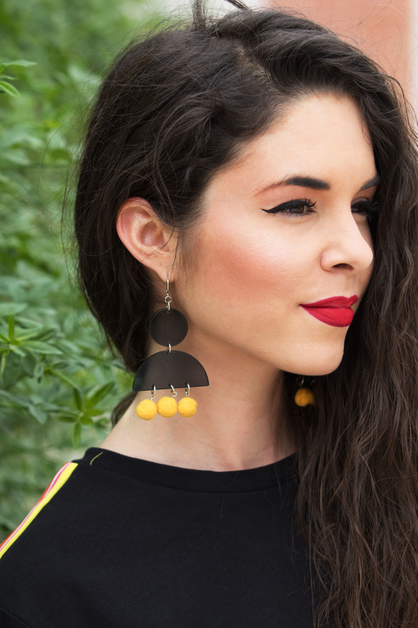 Plexiglass ημικύκλιο και κύκλος σε φιμέ μαύρο χρώμα με κίτρινα pon-pon. Επιλέξτε ένα όμορφο σκουλαρίκι με πινελιές από χρώμα!