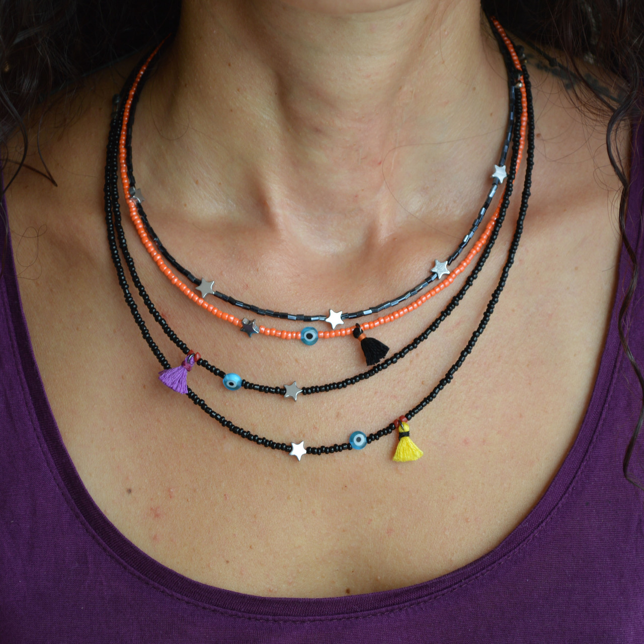 Με γυάλινες seed beads χρώμα κοραλι-πορτοκαλί, αστεράκι αιματίτη, γυάλινο ματάκι και μαύρο φουντάκι χειροποίητο.