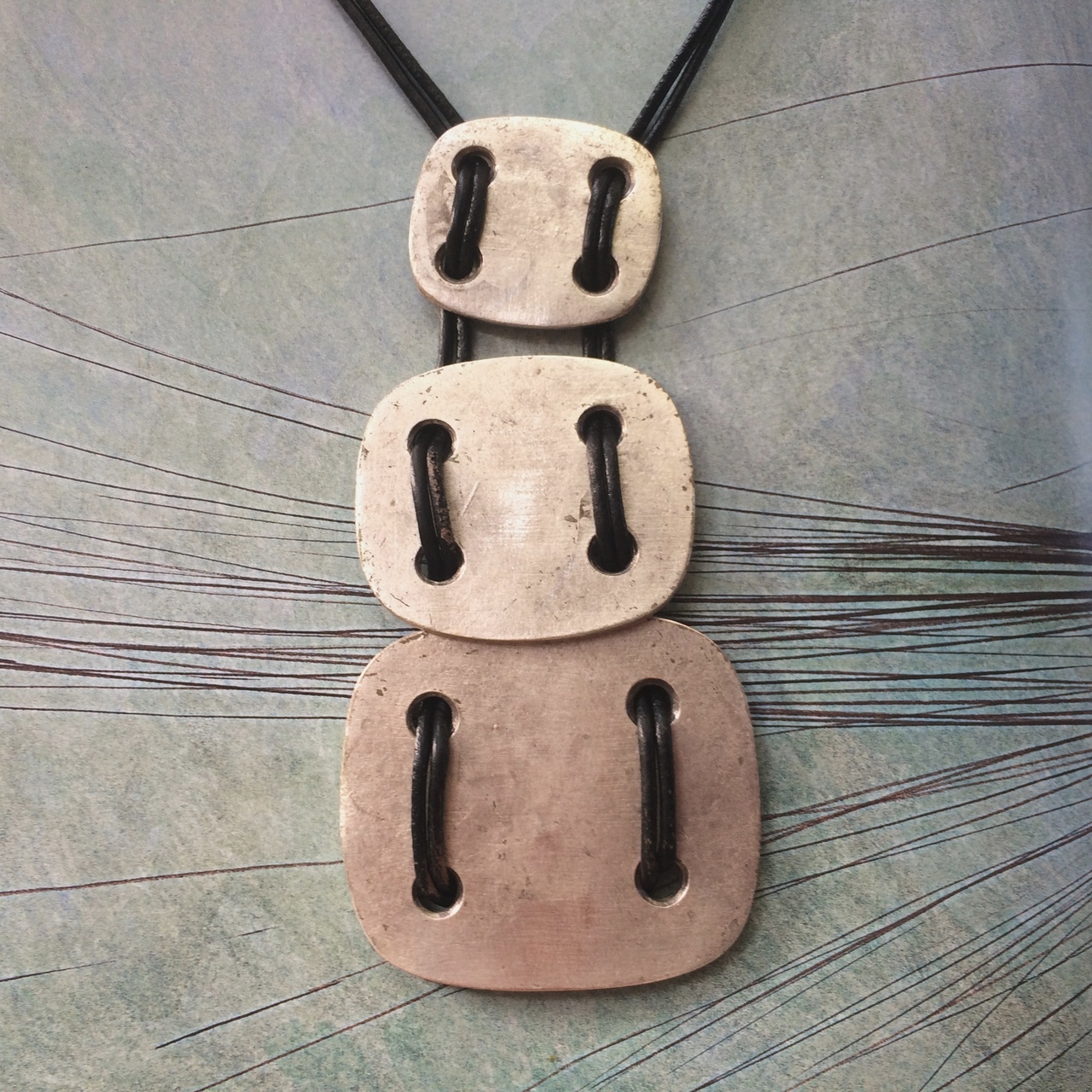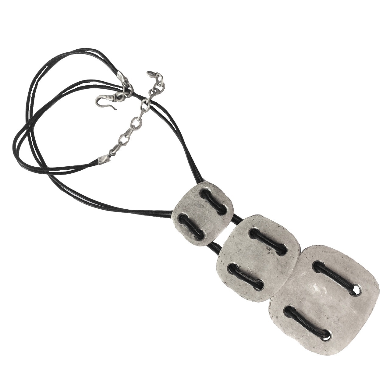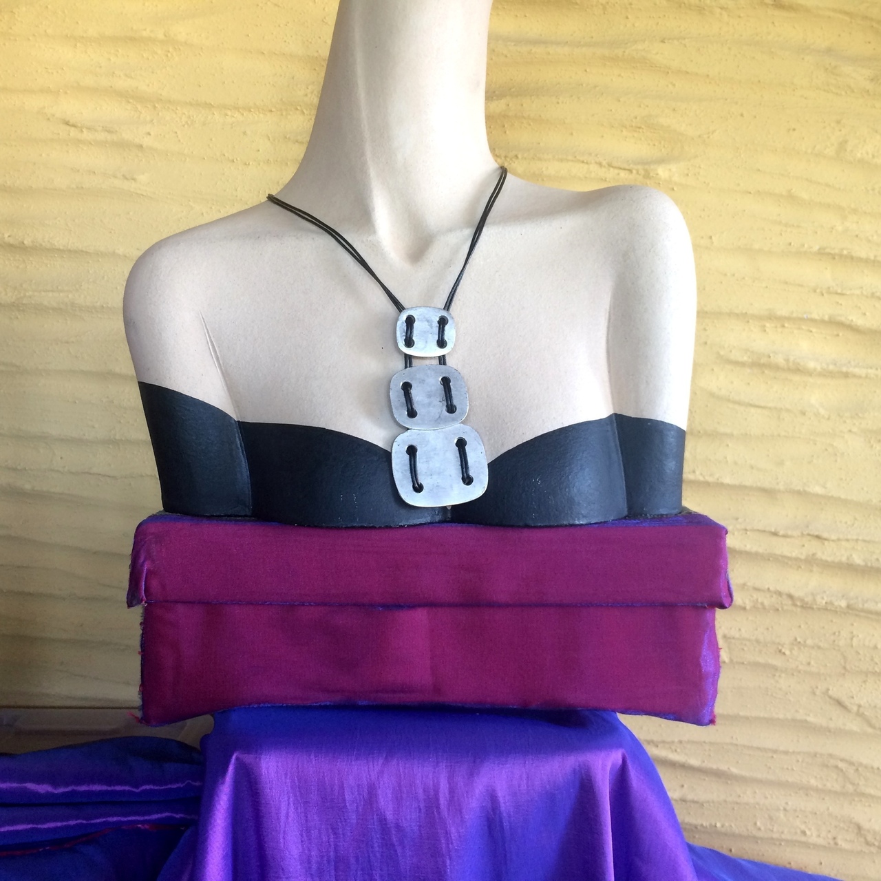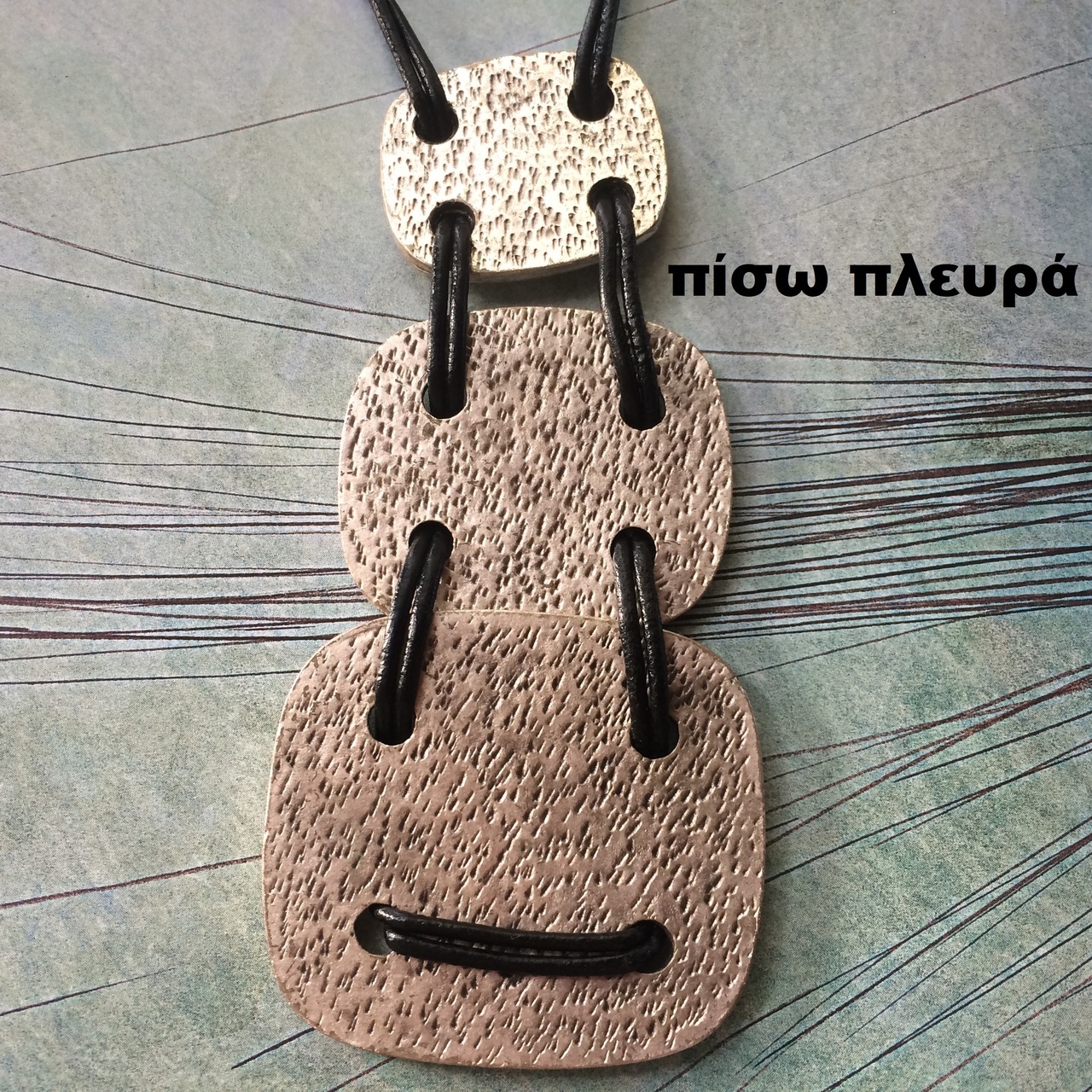 3 μεταλλικά τετράγωνα, "ράβονται μεταξύ τους με δερμάτινο μαύρο κορδόνι, που κλείνει στον λαιμό με μεταλλικό γαντζάκι και επεκτείνεται ελαφρά με αλυσιδάκι. Όλα τα μεταλλικά στοιχεία είναι από κράμα που μιμείται το ασήμι