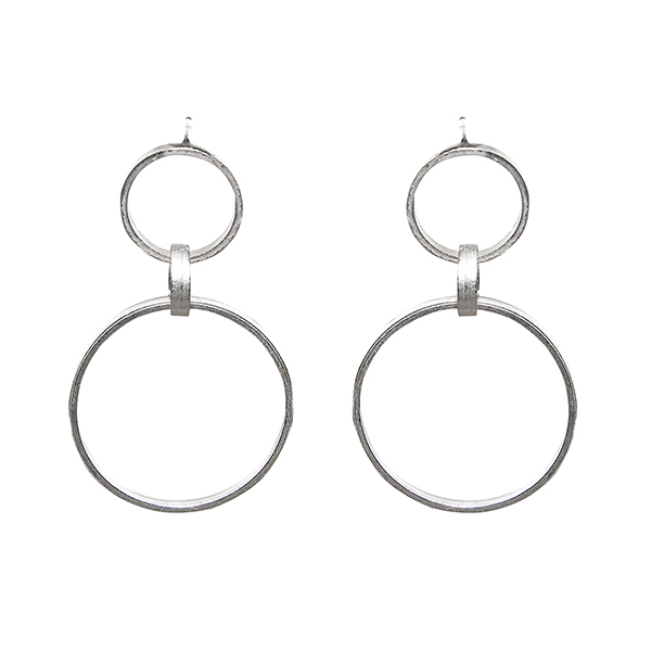 Καρφωτά χειροποίητα σκουλαρίκια από ασήμι 925, κρεμαστά, με κίνηση από τη συλλογή "Κύκλοι". Αποτελούνται από τρεις ασημένιους κύκλους διαφορετικής διαμέτρου που εμπλέκονται ο ένας με τον άλλον θυμίζοντας αλυσίδα. Η κίνηση τους προσδίδει παιχνίδισμα παράλληλα με την γεωμετρική απλότητά τους.