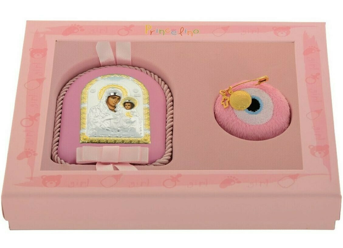 Το σετ αποτελείτε από ασημένια εικόνα Παναγία με βρέφος, σε ροζ πλαίσιο και συνοδεύεται από ροζ υφασμάτινο ματάκι, με παραμάνα και κρεμαστό Κωνσταντινάτο.
