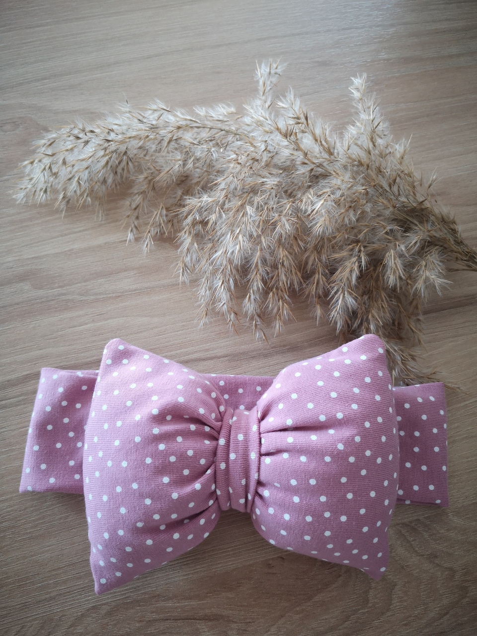 κορδελα ελαστική με φουσκωτο φιογκο σε χρωμα ροζ με λευκο πουα για παιδια απο 0-7ετων