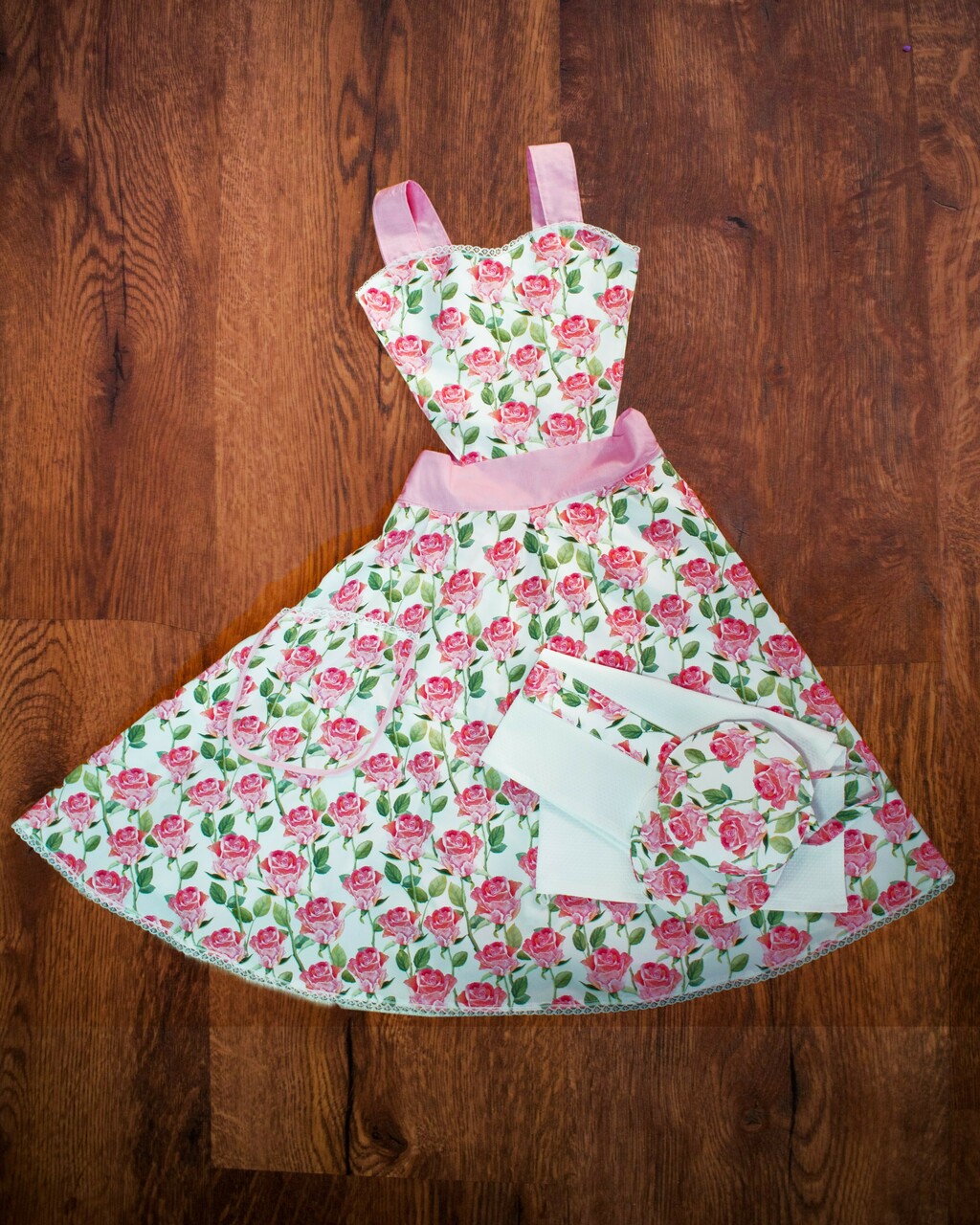 Μια μοναδικη ρετρο ποδια κουζινας, με ροζ τριανταφυλλα, συνοδευομενη απο λευκη πετσετα ποτηριων διακοσμημενη με υφασμα απο το κυριο θεμα καθως και πιαστρακια για ζεστα σκευη ενωμενα μεταξυ τους με κορδελα.