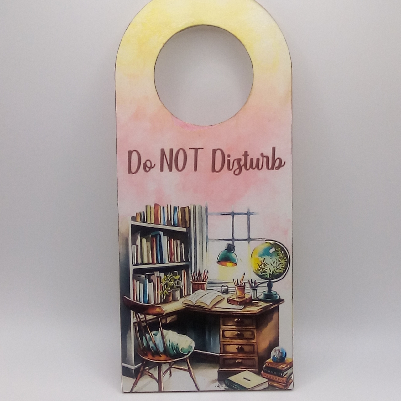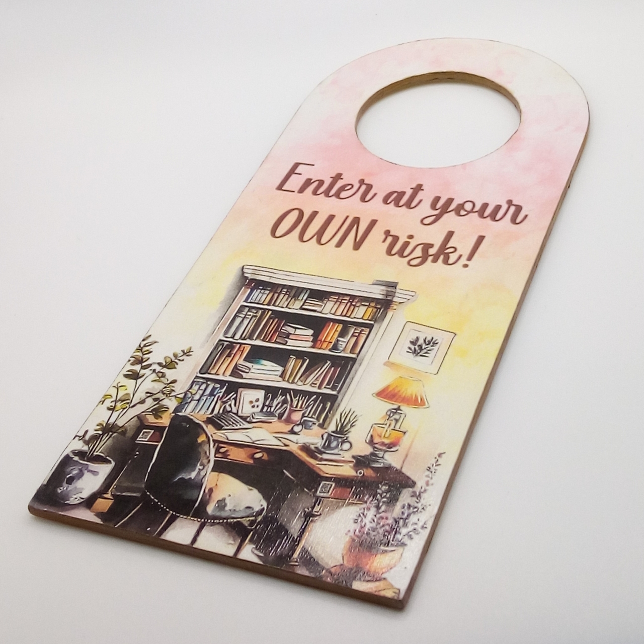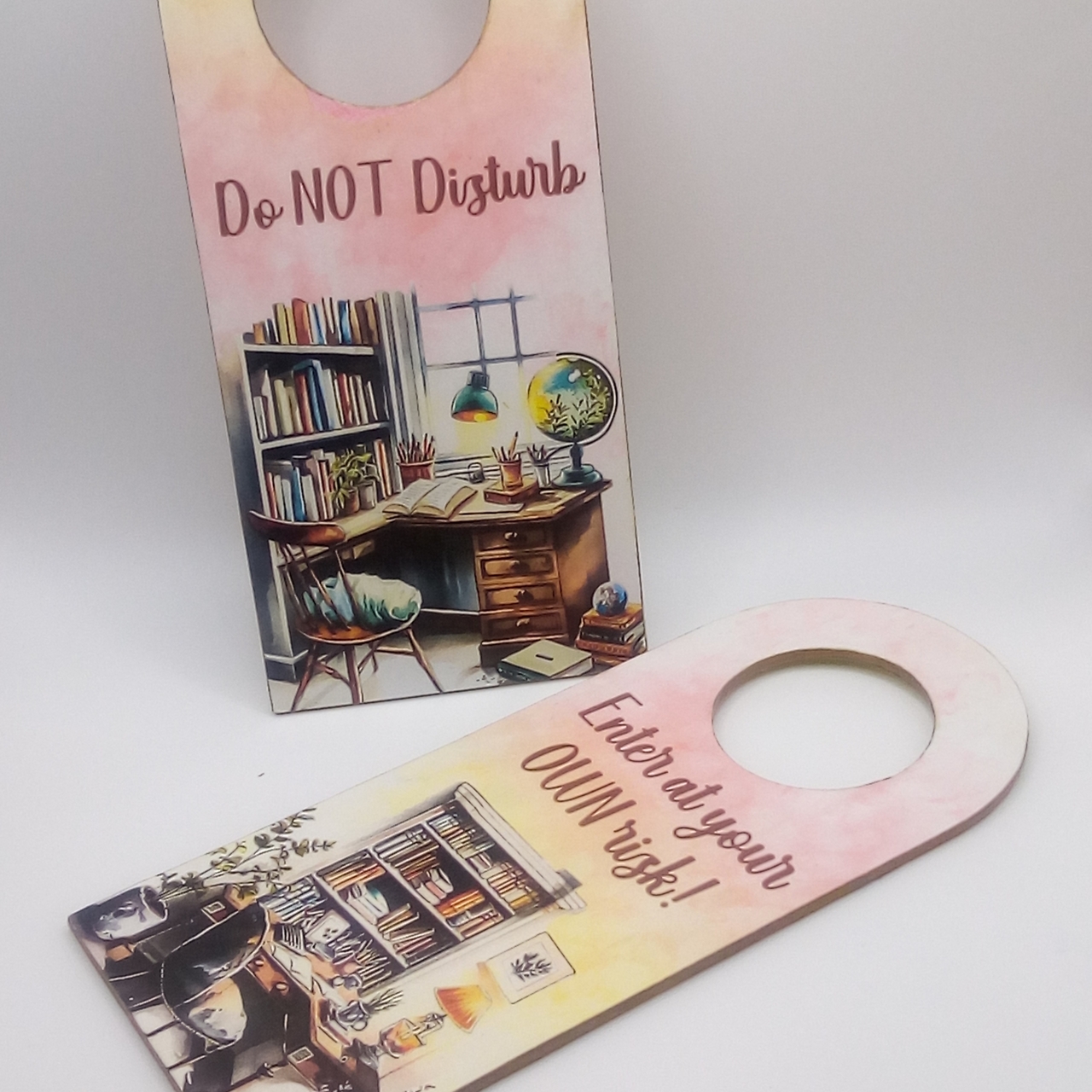 Μία διαφορετική παράσταση χώρου γραφείου στο σπίτι απεικονίζεται σε κάθε πλευρά με το λεκτικό "Do NOT Disturb" στην μία και το "Enter at your OWN risk!" στην άλλη.