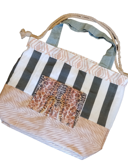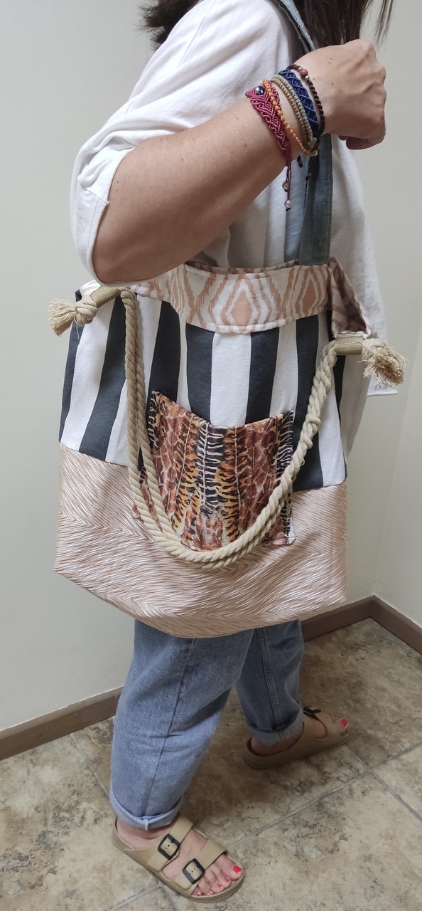 Τσάντα Θαλάσσης Χειροποίητη με συνδυασμό υφασματων και χρωμάτων. Έχει εξωτερική τσέπη Ανιμαλ πριντ, Υφασμάτινα χερούλια ώμου, σκοινί μπεζ ώμου και εσωτερικό υφασμα-φοδρα. Διαστασεις:51*45εκ.