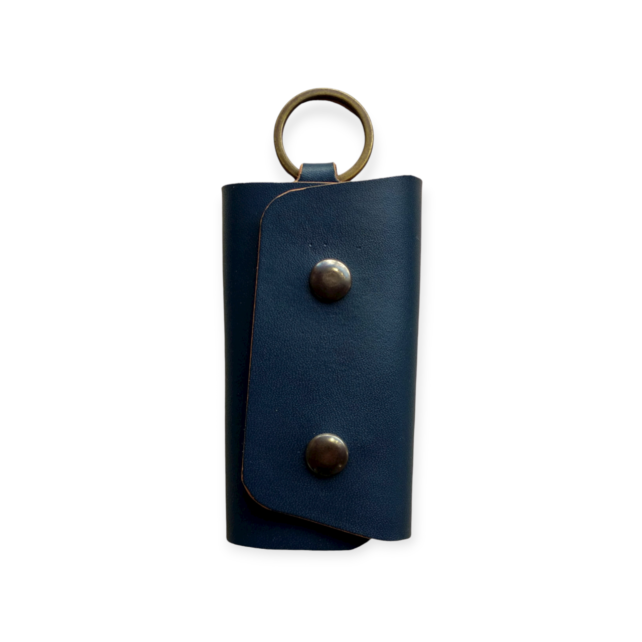 Χειροποίητη δερμάτινη κλειδοθήκη μπρελόκ, σε μπλε χρώμα. Κλείνει με δύο κουμπιά και εσωτερικά έχει 6 θέσεις για κλειδιά. Διαστάσεις: 7 επί 11 εκ.