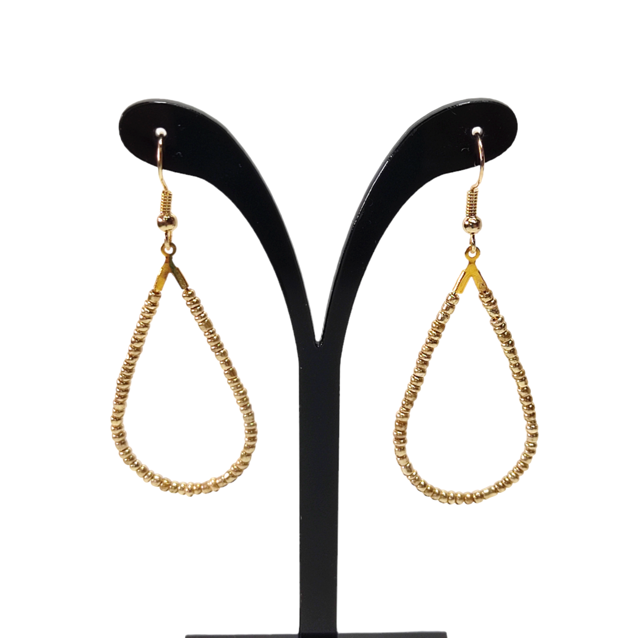 Κρεμαστά σκουλαρίκια σχήμα δάκρυ με μικρές χρυσές χάντρες. Μήκος περίπου 6 εκατοστά. Κομψά σκουλαρίκια για όλες τις ώρες. Θα τα παραλάβετε σε συσκευασία δώρου.