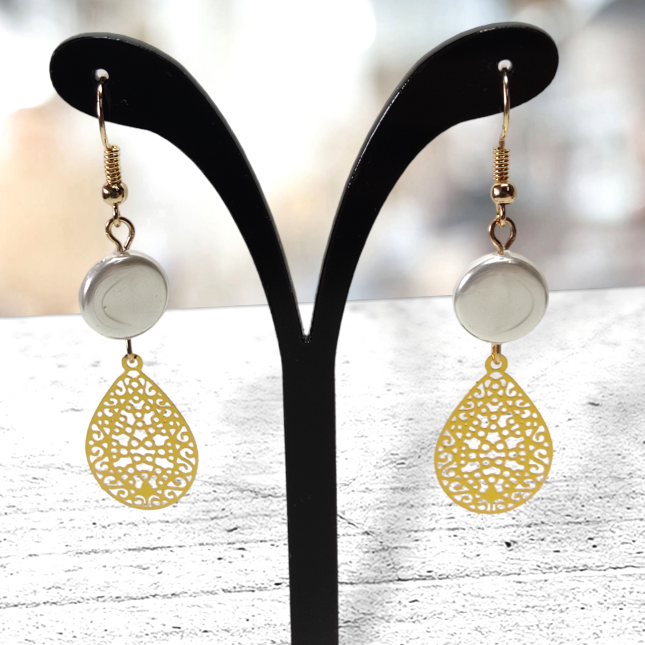 Κρεμαστά σκουλαρίκια επίχρυσα με πλακέ ακρυλική χάντρα και φιλιγκρί επίχρυσο δάκρυ. Μήκος περίπου 5,5 εκατοστά. Κομψά σκουλαρίκια για όλες τις ώρες. Θα τα παραλάβετε σε συσκευασία δώρου.