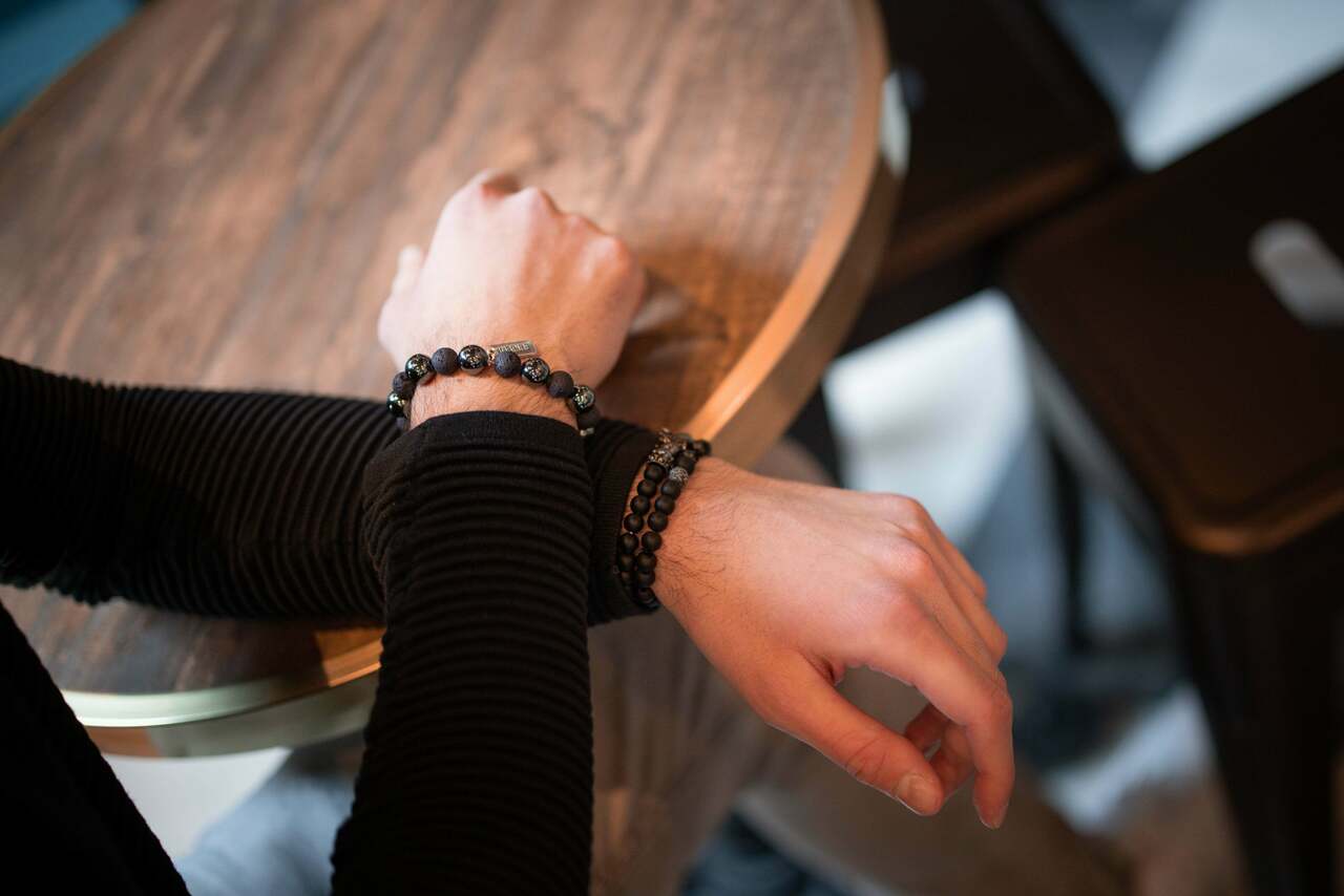 Ανδρικό βραχιόλι με χάντρες από λάβα και μέταλλο σε μαύρο και μαύρο μπλε χρώμα και ασημένια διακοσμητική πλάκα από ανοξείδωτο ατσάλι.