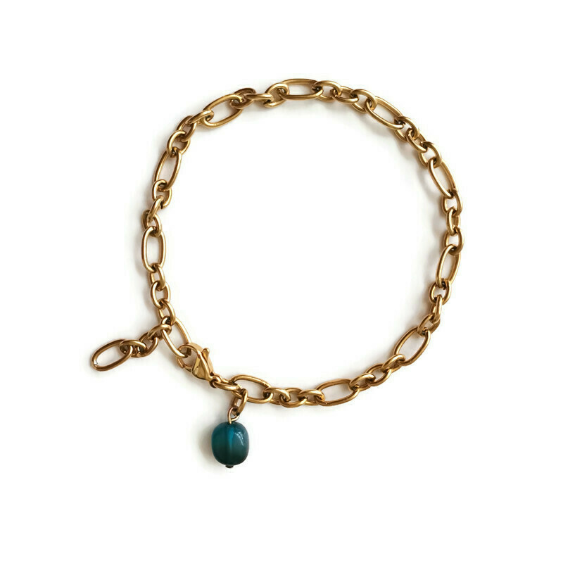 Κομψό και εντυπωσιακό βραχιόλι από ατσάλινη αλυσίδα, με μπλε χάντρα από αχάτη.