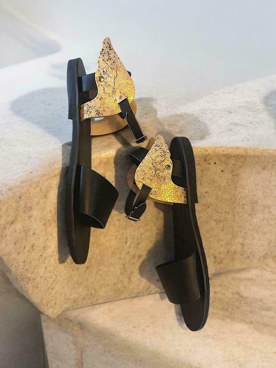 These statement sandals blend sleek black leather with a breathtaking golden wing-inspired design, evoking the spirit of mythology and modern luxury. The intricate crackled leather on wings catches the light with every step, making them the perfect fusion.