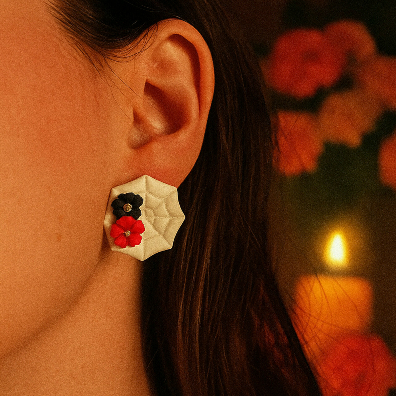 Ο ιστός, σύμβολο της νύχτας και του μυστηρίου, γίνεται γιορτινός όταν στολίζεται με λουλούδια Día de los Muertos. Σαν μικρά altars, αυτά τα σκουλαρίκια θυμίζουν πως ακόμα και οι πιο σιωπηλές γωνιές της ζωής μπορούν να ανθίσουν με χρώμα και μνήμη.Χειροποίητα καρφωτά σκουλαρίκια από πολυμερικό πηλό σε σχήμα ιστού αράχνης, διακοσμημένα με κόκκινο και μαύρο λουλούδι.