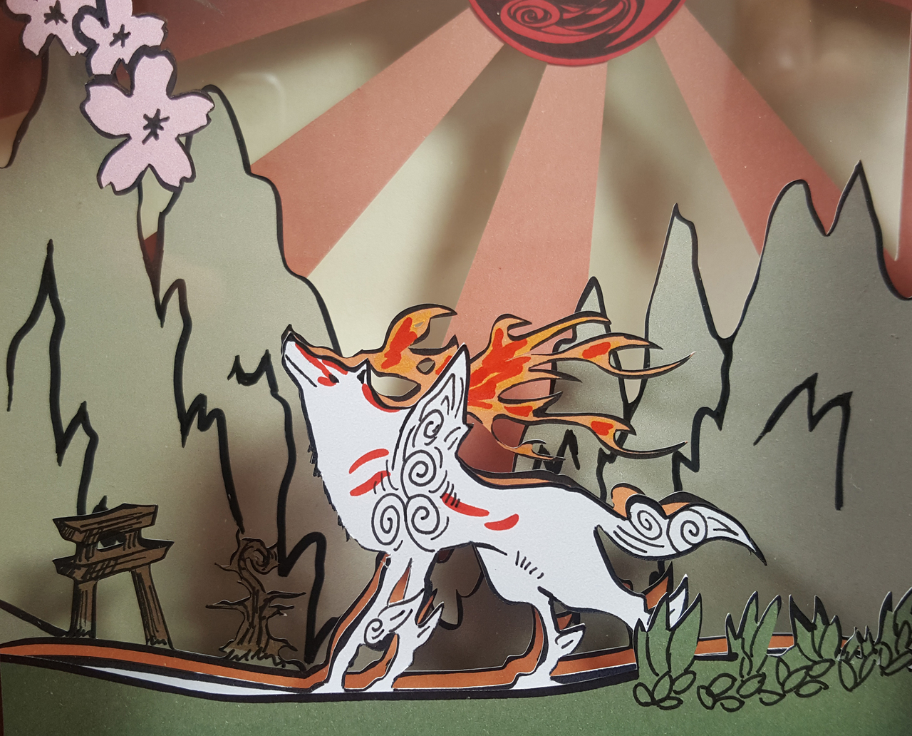 Προτότυπο και ιδιαίτερο φωτάκι νυκτός, με θέμα το video game, Okami, φτιαγμένο απο χαρτί με papercut! 6 χρωματιστά φύλλα χαρτιού, το καθένα με διαφορετική παράσταση, τοποθετούνται σε διαφορετικά επίπεδα, δίνοντας την αίσθηση του τρισδιάστατου! Τοποθετούνται σε ένα βαμμένο στο χέρι κουτί, και η πρόσοψη προστατεύεται με γυαλί.