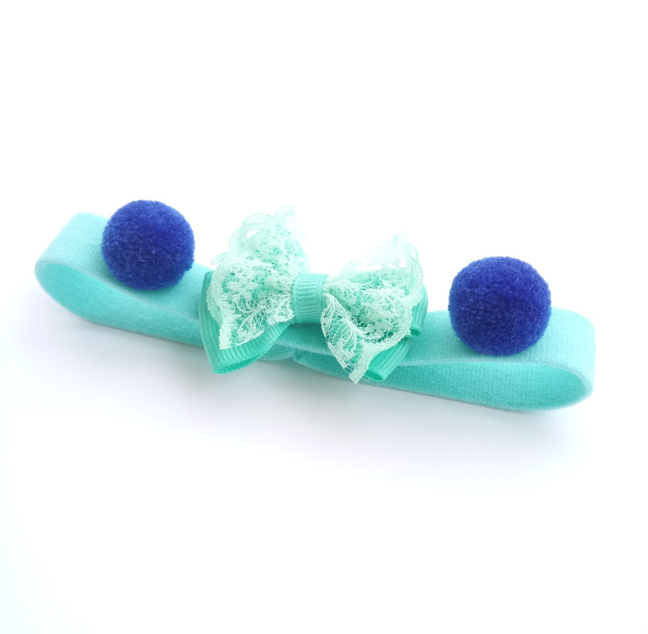 Γαλάζια βεραμάν κορδέλα από λάστιχο! Έχει φιογκάκι από γκρο κορδέλα στο ίδιο χρώμα, λευκή δαντέλα... και δύο μικρά Pom Pon από κασμίρ σε σκούρο μπλε χρώμα. Είναι ελαφριά και μαλακή! Ιδανική για νεογέννητο ! So Cute ♥ Η περίμετρος της είναι 32 cm (και αν τεντωθεί 40 cm ) και το φάρδος της είναι 1,5 cm.