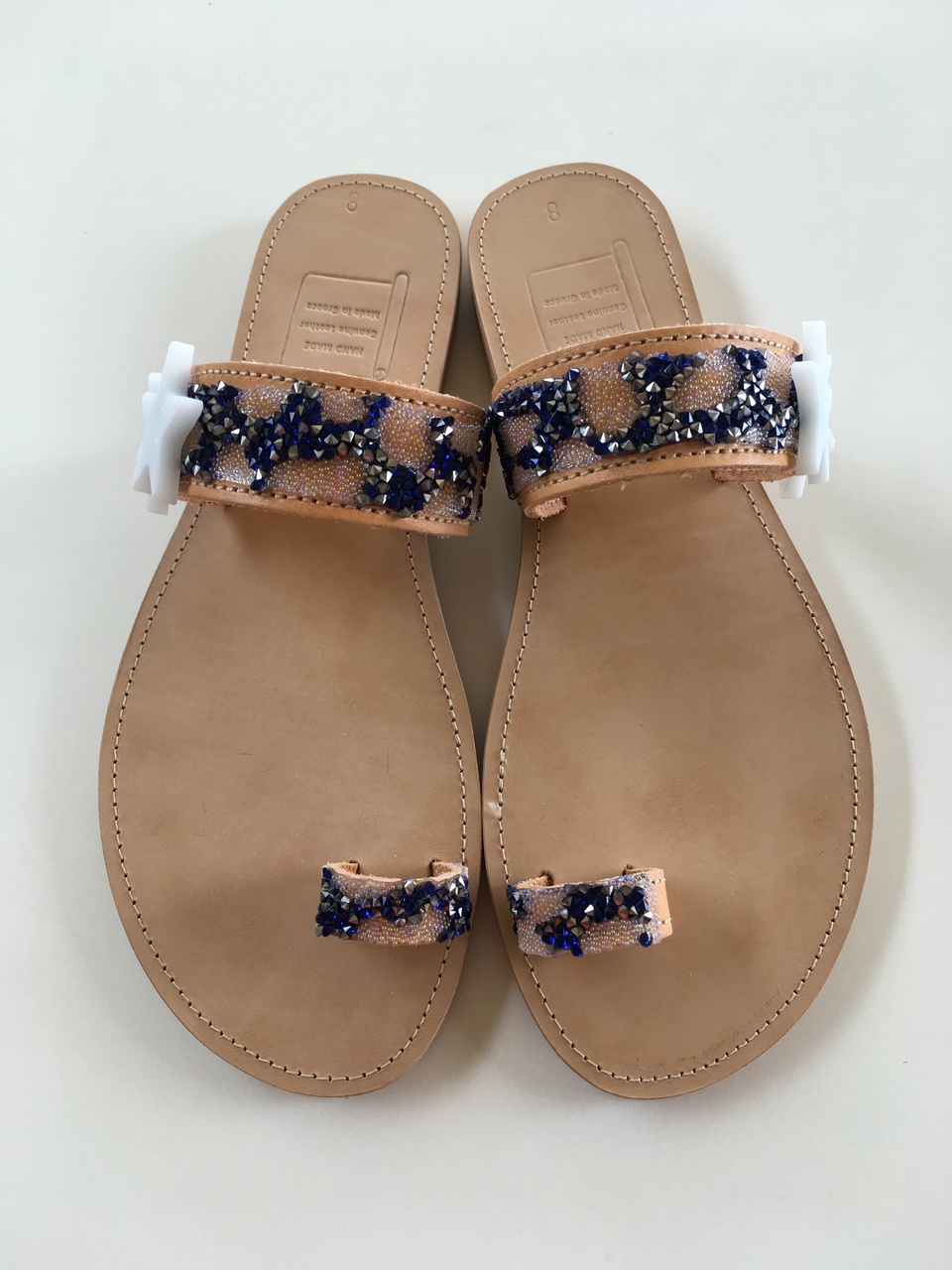Φλατ δερμάτινα σανδάλια, διακοσμημένα με τρέσα χαβιάρι και χειροποίητα αστέρια από υγρό γυαλί.