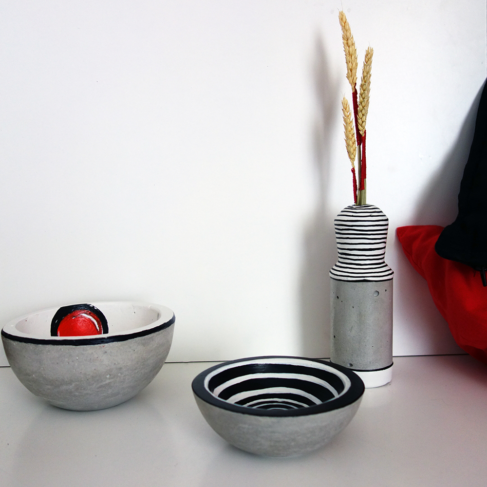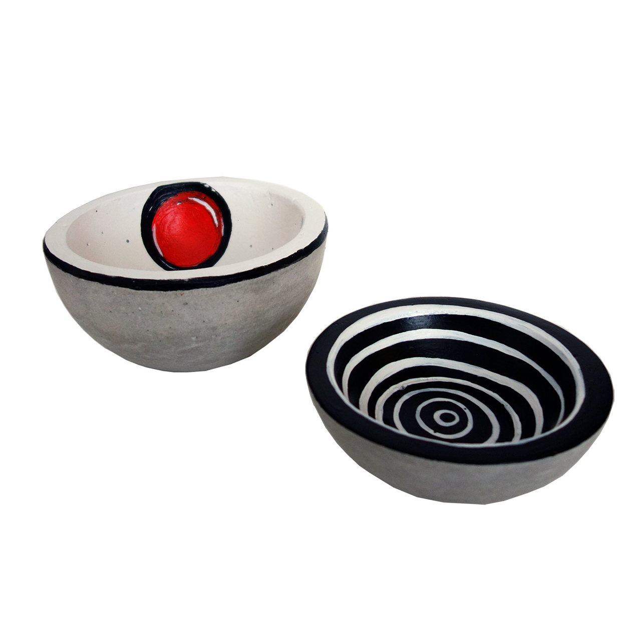 Σετ που αποτελείται από δύο μπολ από μαύρο τσιμέντο, ζωγραφισμένα στο χέρι και περασμένα με ακρυλικό οικολογικό βερνίκι. Το υλικό και τα χρώματα του δίνουν μια μοντέρνα και φρέσκια αισθητική και διάθεση, που θα μπορούσε όμως να δέσει αρμονικά και με κλασσική διακόσμηση, μια και οι ρίγες έχουν δια...