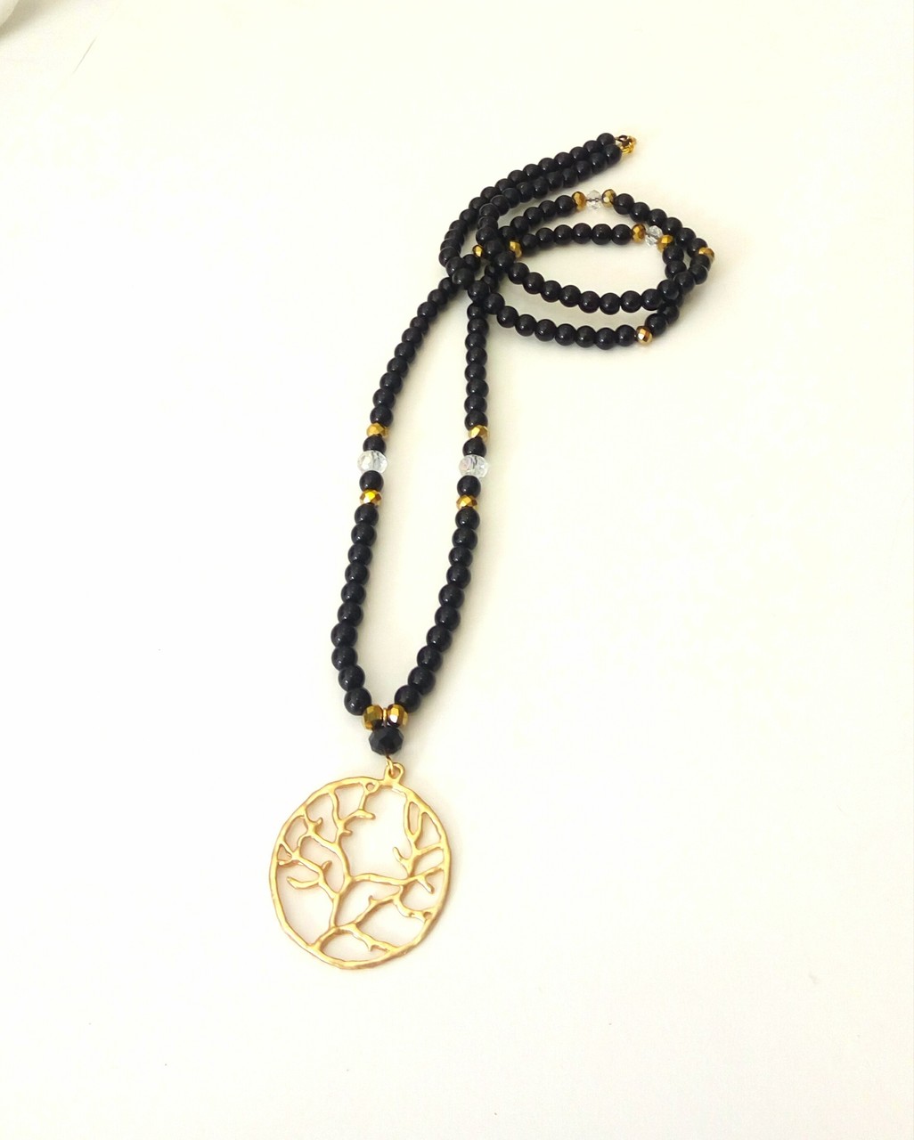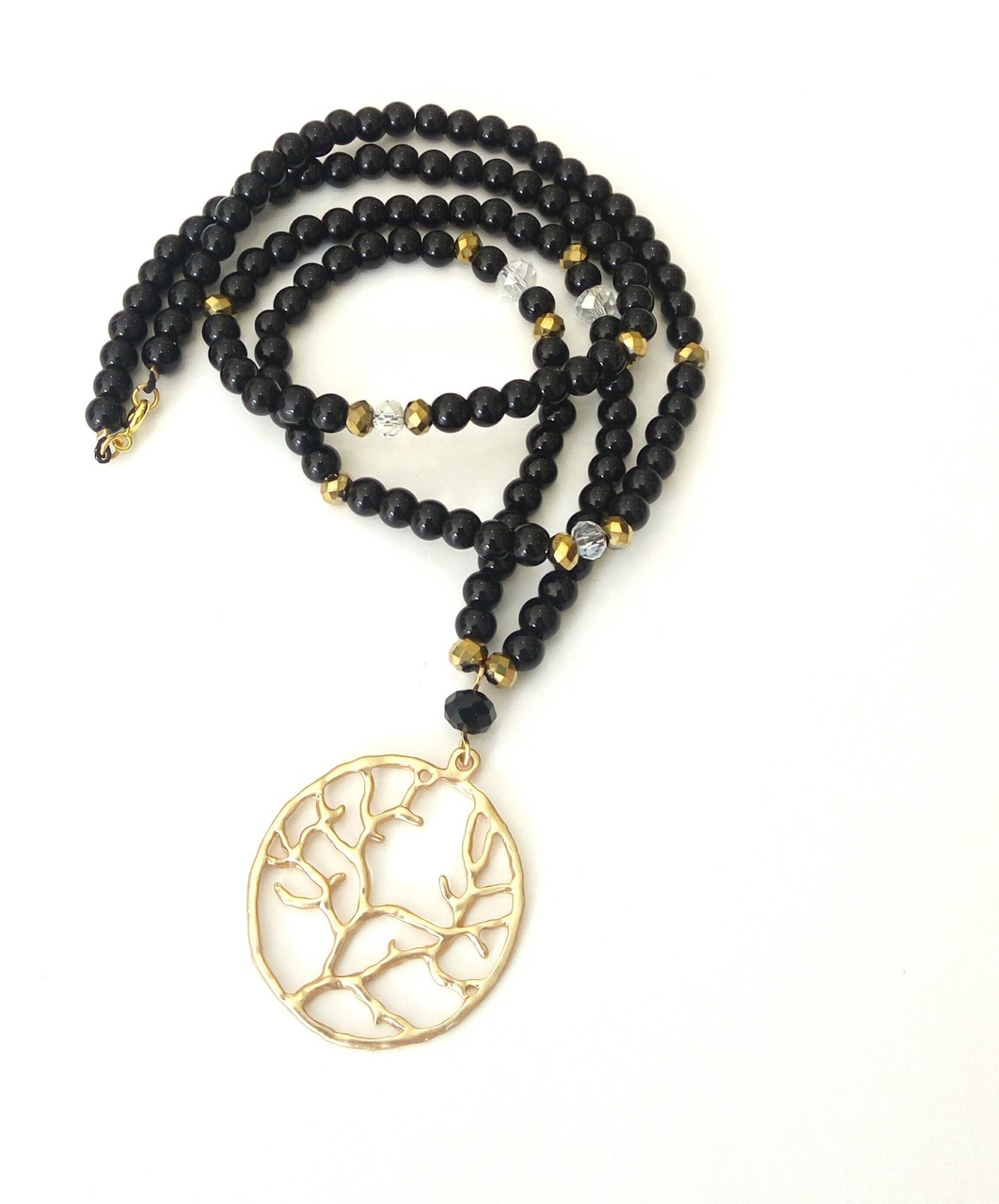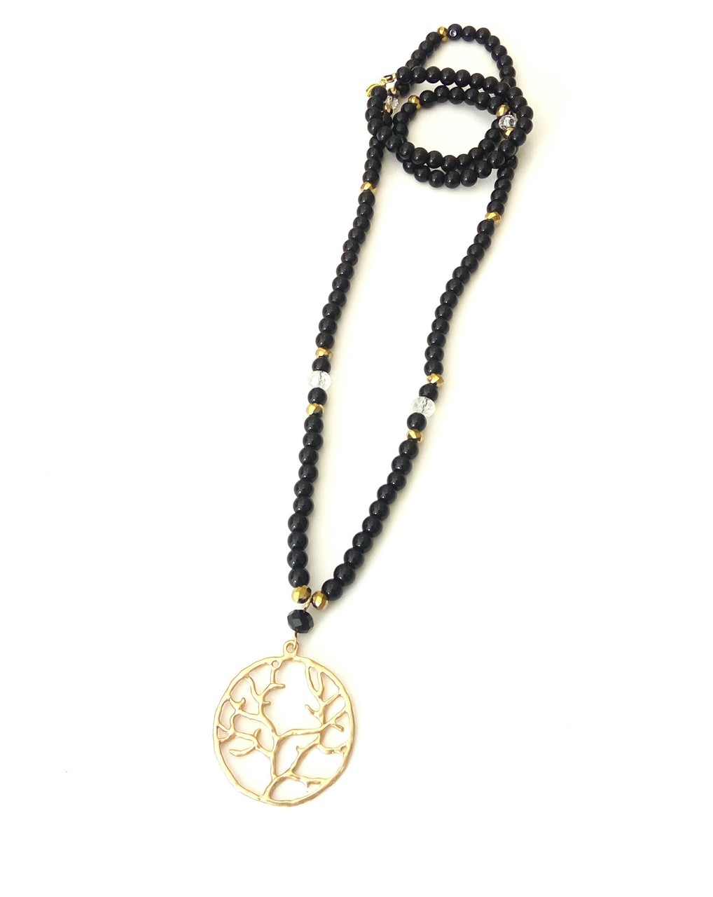 Κολιέ χειροποίητο με μαύρες γυάλινες χάντρες και κρεμαστό επίχρυσο στοιχείο το δέντρο της ζωής.