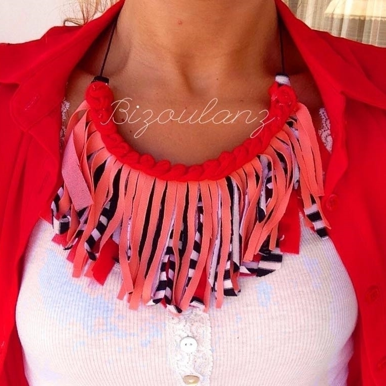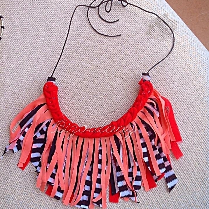 Κολιέ κοντό με κρόσια σε πορτοκαλί, κόκκινο και ασπρόμαυρο. Εξολοκλήρου φτιαγμένο από ύφασμα πάνω σε μεταλλική βάση χαμόγελο. Η τέλεια επιλογή σεέθνικ στυλ που δεν περνά απαρατήρητη.