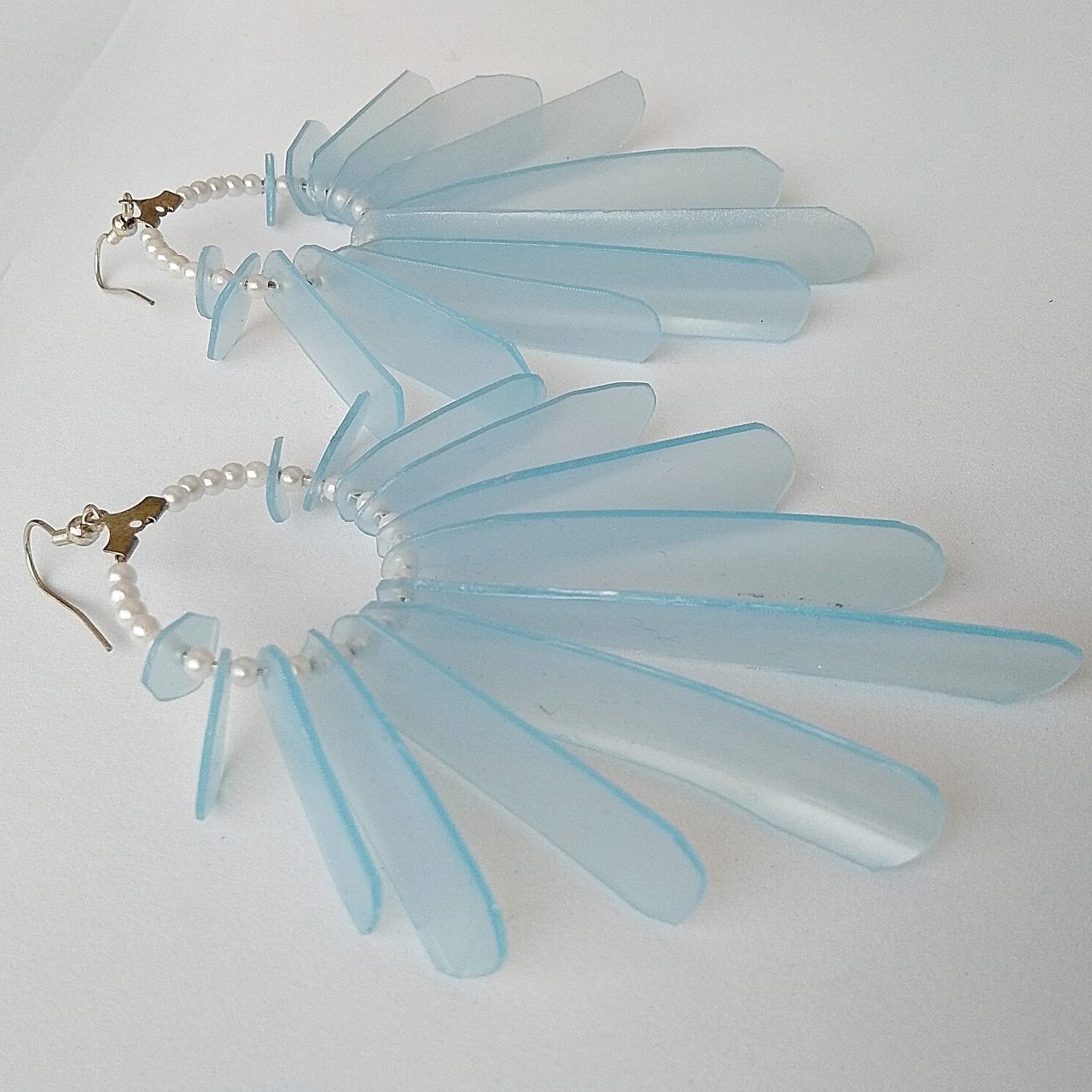 Σκουλαρίκια μικροί κρίκοι με ακρυλικές πέρλες και ανακυκλωμένο λευκό πλαστικό σε γαλάζιο ημιδιάφανο χρώμα.